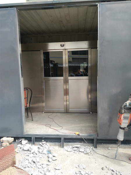 2、自動門貨淋室的底板一般 由不銹鋼板做成,殼體用不銹鋼或厚鋼板鈑金折彎電焊焊接表層為奶白色噴漆。